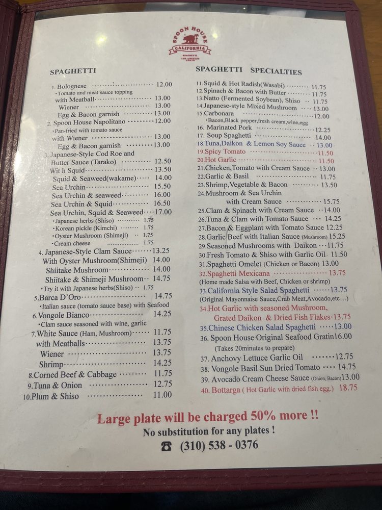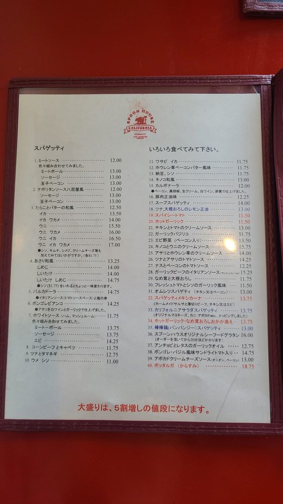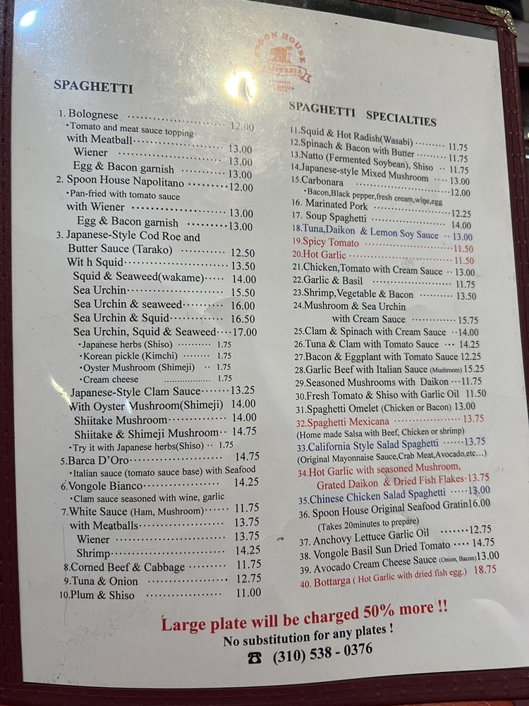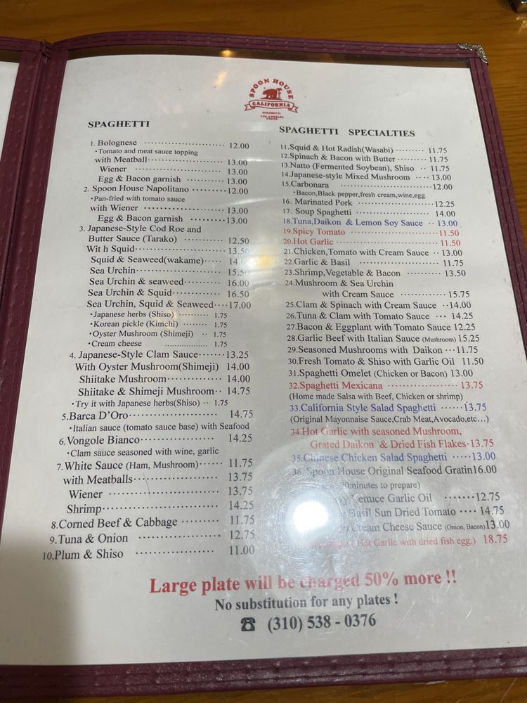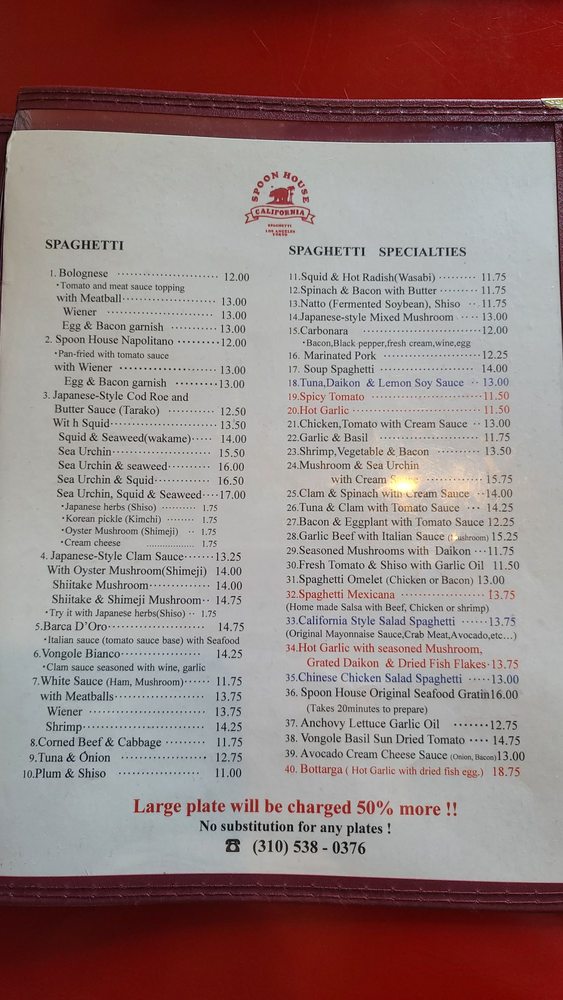 Introducing the menu at Spoon House Bakery & Restaurant: This cozy establishment located in Gardena, CA offers a unique fusion of Italian and Japanese cuisine. From traditional Bolognese tomato and meat sauce spaghetti to innovative dishes like Japanese Style Mixed Mushroom spaghetti, the menu caters to a variety of preferences. Customer favorites include the Avocado Cream Cheese Sauce and the Plum & Shiso spaghetti. Don't miss out on the must-try $1 salad with its delicious dressing. The homemade bread served at the beginning of the meal is a hit with diners. With attentive service and a charming ambiance, Spoon House is a hidden gem for those seeking a memorable dining experience. Don't forget to pair your meal with a refreshing beverage like the coffee float. Spoil yourself with the seafood gratin that takes 20 minutes to prepare. Explore the eclectic menu at Spoon House for a culinary adventure you won't soon forget.