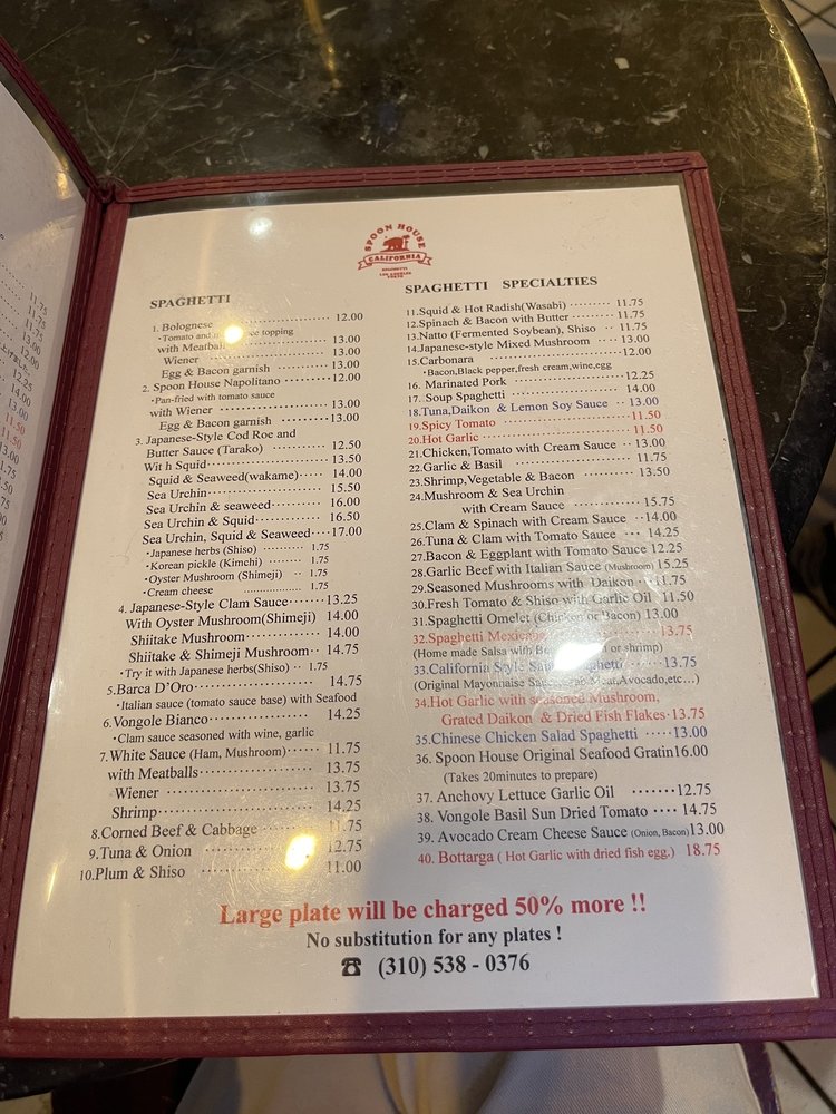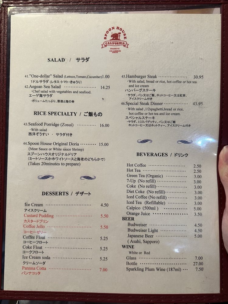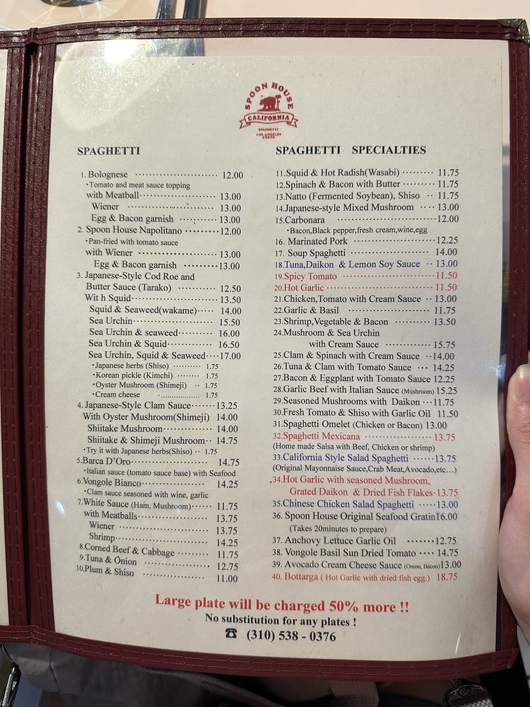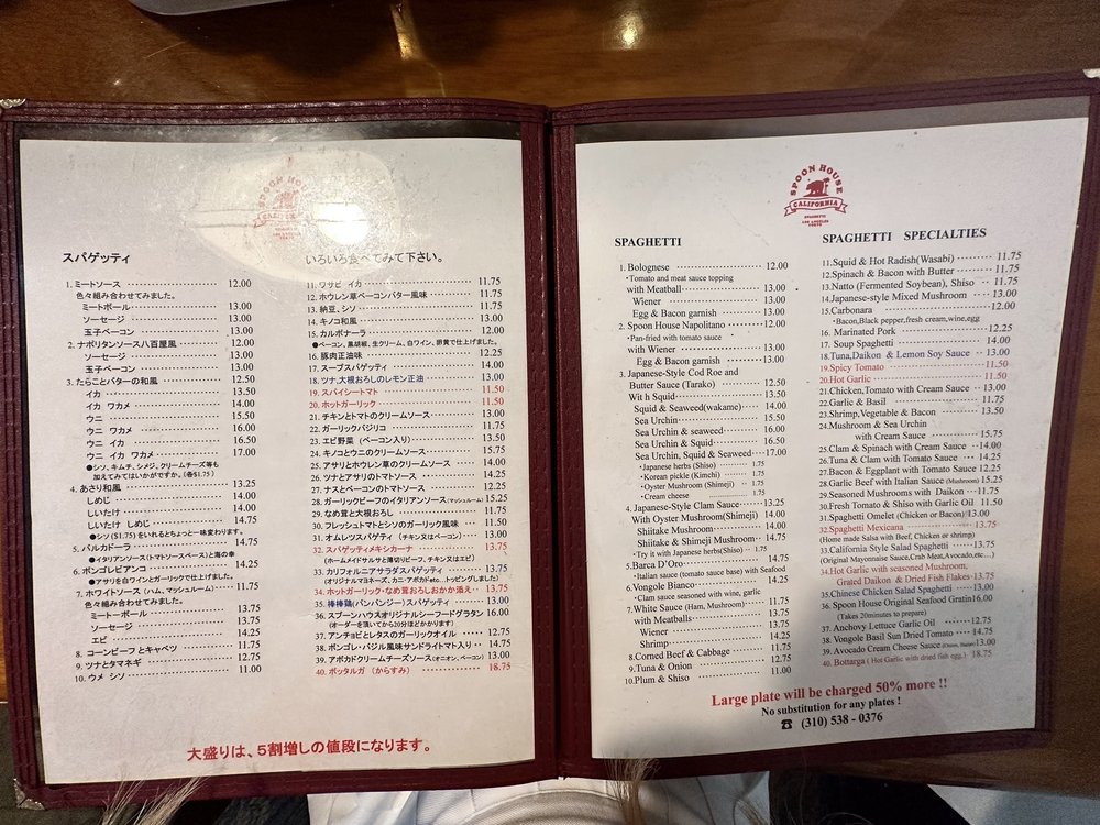 Introducing the menu at Spoon House Bakery & Restaurant: This cozy establishment located in Gardena, CA offers a unique fusion of Italian and Japanese cuisine. From traditional Bolognese tomato and meat sauce spaghetti to innovative dishes like Japanese Style Mixed Mushroom spaghetti, the menu caters to a variety of preferences. Customer favorites include the Avocado Cream Cheese Sauce and the Plum & Shiso spaghetti. Don't miss out on the must-try $1 salad with its delicious dressing. The homemade bread served at the beginning of the meal is a hit with diners. With attentive service and a charming ambiance, Spoon House is a hidden gem for those seeking a memorable dining experience. Don't forget to pair your meal with a refreshing beverage like the coffee float. Spoil yourself with the seafood gratin that takes 20 minutes to prepare. Explore the eclectic menu at Spoon House for a culinary adventure you won't soon forget.